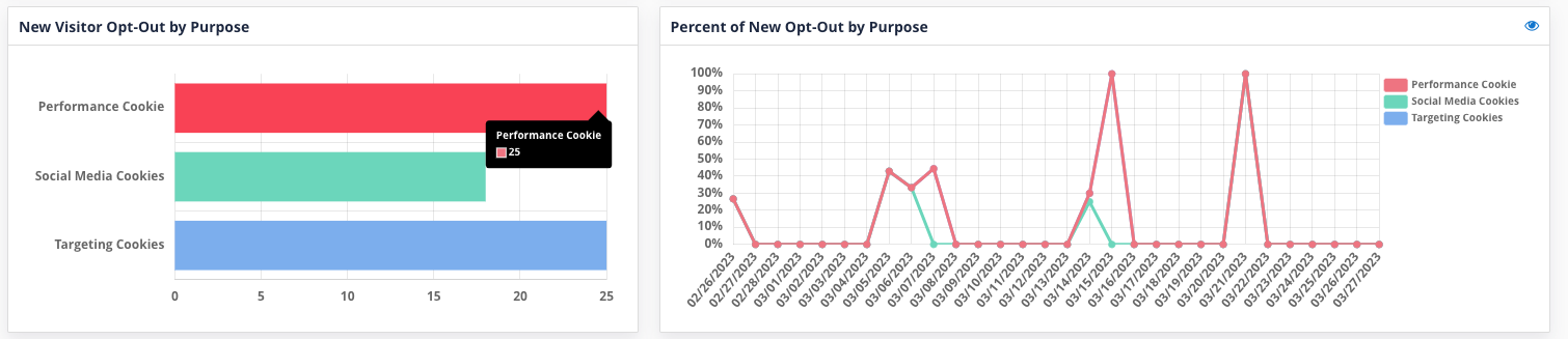 New Visitors Opt-out shows the Opt-out (deny or reject) by consent group. This is due to the site visitor choosing to Reject All or if the site visitor chooses to disable certain consent groups in the Preference Center.